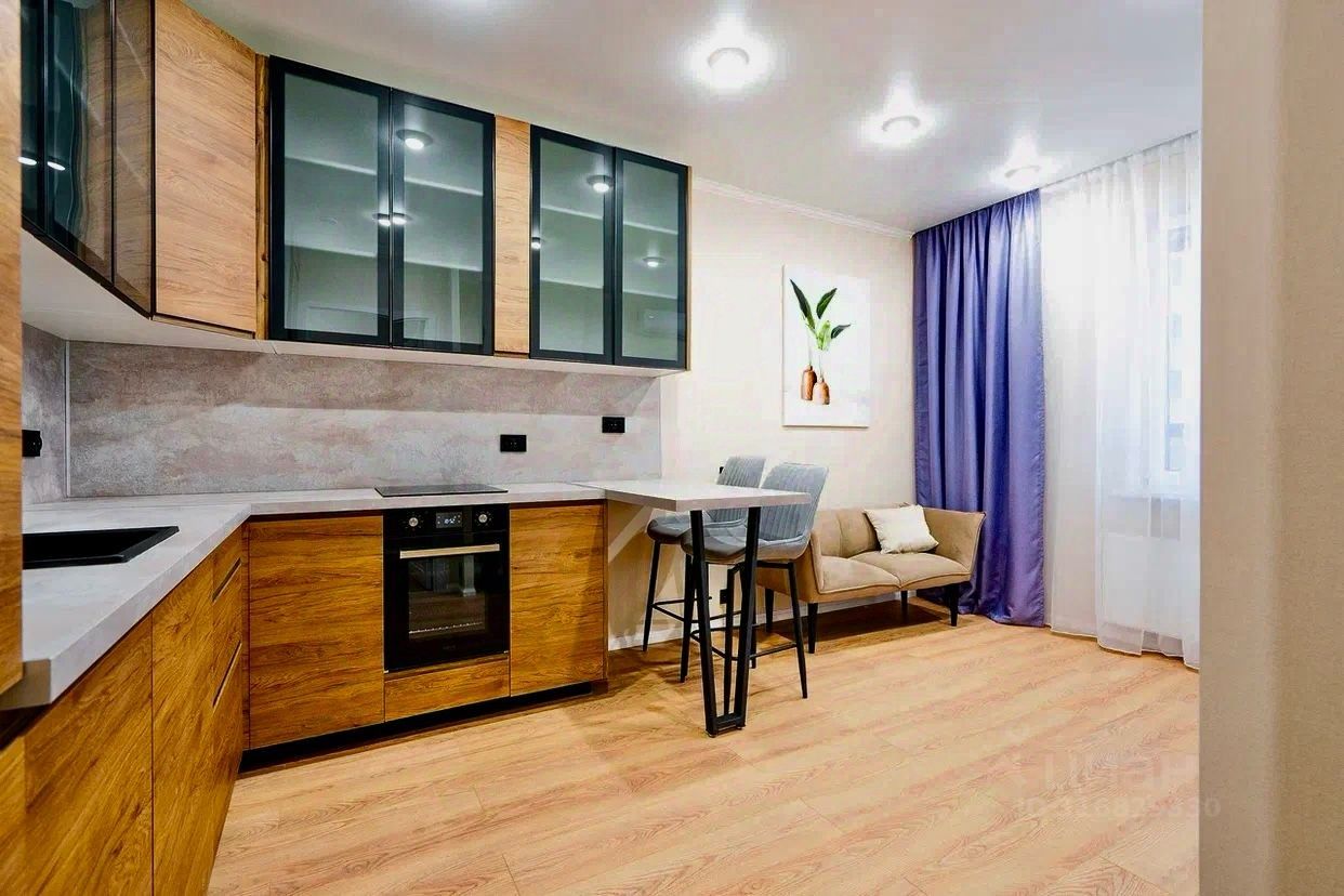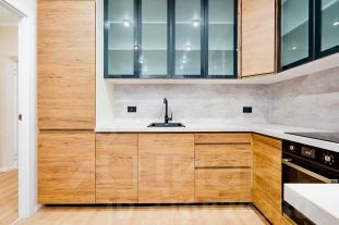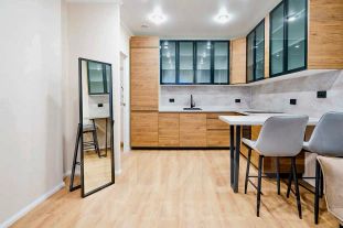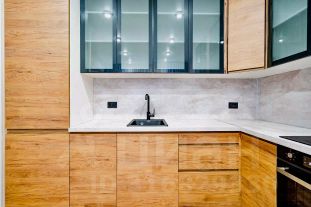 Современная кухня с барной стойкой, укомплектована всей необходимой встроенной бытовой техникой. Большая рабочая поверхность.