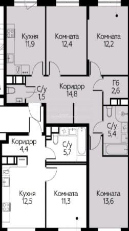Площадь комнат: 13.6 + 12.3 + 12.2 м²