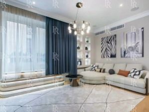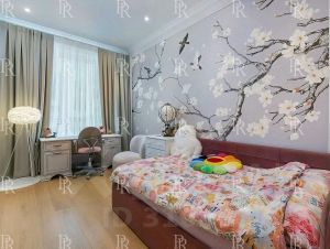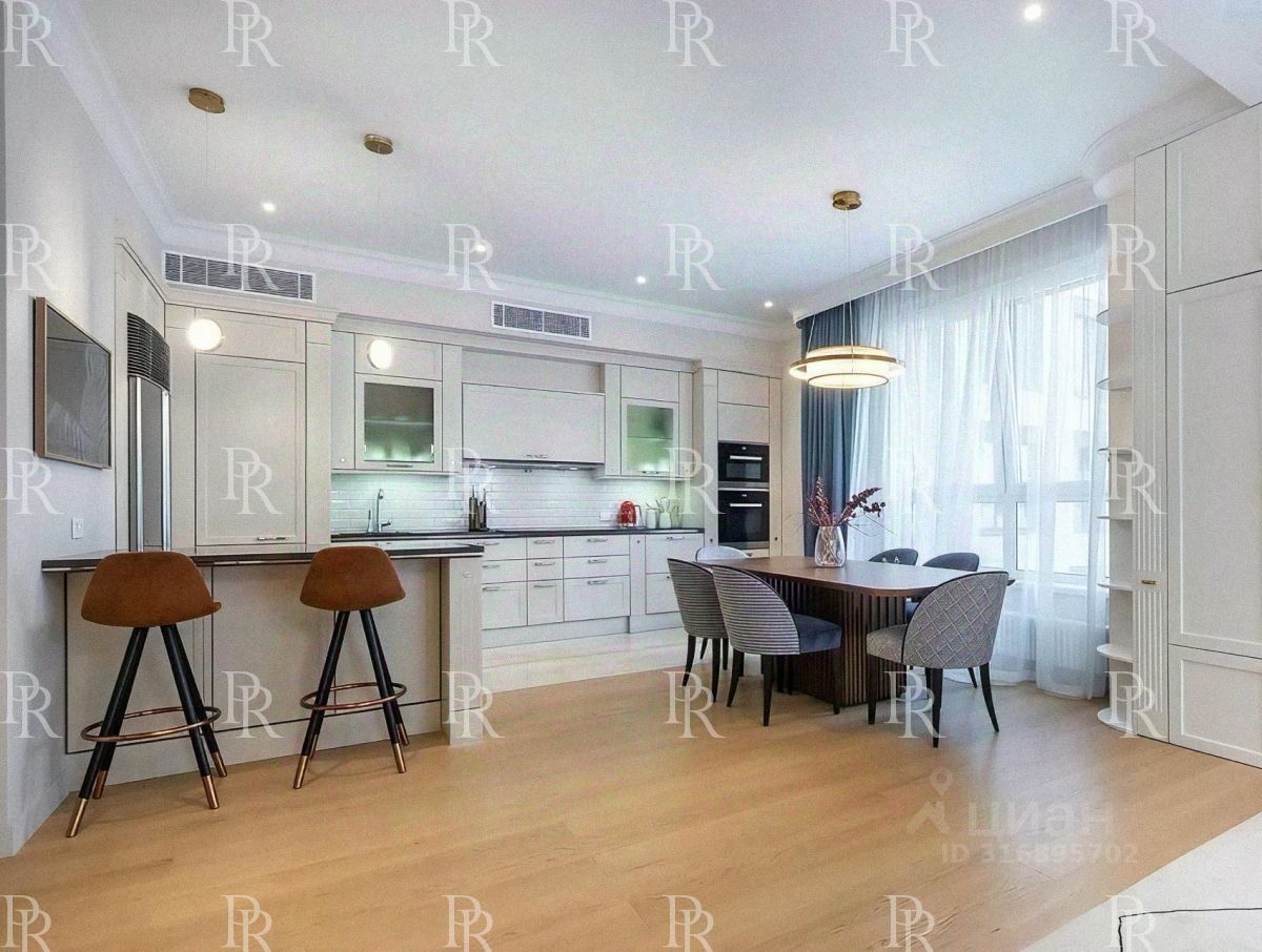 Интерьер выполнен в стиле утончённой неоклассики. Светлая сдержанная палитра стен, полы из ореховой паркетной доски, высокие потолки 3,1 метра с эффектной архитектурой и скрытыми инженерными системами создают идеальное сочетание функциональности и эстетики. Белоснежная кухня оснащена встроенной витриной с декоративной подсветкой и барной зоной.