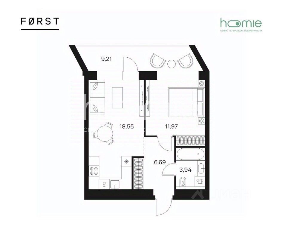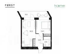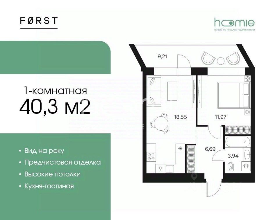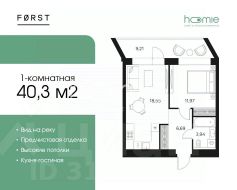 Просторная однокомнатная квартира с предчистовой отделкой в ЖК "FORST"и видом на воду на 19 этаже. Общая площадь: 40,3 кв.м., жилая: 11.97 кв.м., площадь просторной кухни-столовой: 18.55 кв.м. Все окна выходят на одну сторону. В квартире один совмещенный санузел. Терраса площадью 9.21 кв.м. Высота потолков 2.85 м.
