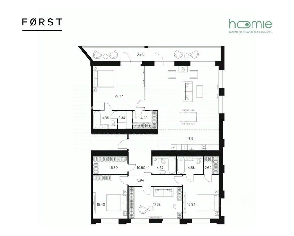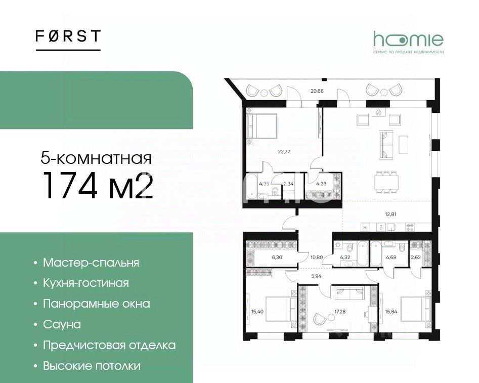 Роскошная пятикомнатная квартира с отделкой White Box MAX (улучшенная предчистовая отделка) в ЖК "FORST". Звоните, мы вам все подробно расскажем! Квартира с тремя спальнями в ЖК "FORST" на 20 этаже. Общая площадь: 174кв.м., жилая: 94.29 кв.м., суммарная площадь гостиной-столовой с кухонной зоной: 35.81 кв.м. Европланировка, кухня и гостиная объединены в одно просторное помещение. Квартира без проходных комнат, окна выходят нa три cтopoны дома. В квартире три спальни, просторная видовая терраса 20 кв.м., три совмещенных санузла, сауна, камин. Высота потолков 2.85 м. Квартира с отделкой White Box MAX. Что входит в отделку: Возведение стен, стяжка с шумоизоляцией, гидроизоляция, система защиты от протечек Нептун, Выводы и разводка под электрику и освещение, электрический щит EKF (оборудование Легранд), мастер свет, Бризер очищения воздуха, измельчитель пищевых отходов марки Bone Crusher, Двухкамерные стеклопакеты с алюминиевым профилем ALUTECH, и это далеко не полный список. Этот вариант отделки вы можете посмотреть на фотографиях. Квартира находится в корпусе 4. Дом монолитный, одноподъездный, высотой 20 этажей. На этаже 7 квартир. В подъезде 2 пассажирских и 1 грузовой лифт. Оформление сделки по договору ДКП. Квартира без обременений. Один взрослый собственник. Ключи на руках, возможен просмотр по предварительной записи по телефону. В шаговой доступности от жилого комплекса имеются станции метро (расстояние по прямой): "Тульская" (700 м), "ЗИЛ" (1.3 км), "Автозаводская" (1.9 км). FORST — это истинное место силы, где долгожданная прохлада посреди душного города становится осязаемой, превращая крышу над головой в небо без границ. Комплекс настоящего бизнес-класса на берегу Москвы-реки. В главном лобби проекта установлен камин, в каждом лобби - диванная зона, колясочная и лапомойка. Вход по электронным пропускам. Два пассажирских и 1 грузовой лифт в каждой секции. Предусмотрена общественная видовая терраса для жителей с лаунж зоной и коворкингом. Несколько зон большой придомовой территории (для активного или спокойного отдыха). Спортивная площадка с зоной воркаута, скалодром, игровой детский трек. Предусмотрен подземный паркинг. Скоро открытие детского сада Discovery с билингвистическим подходом. В шаговой доступности: детский сад, школа, супермаркеты, салоны красоты, кафе и рестораны, фитнес-центр. В непосредственной близости ТЦ "Ривьера", ТЦ "Ереван Плаза", спортивно-развлекательный центр "ЦСКА - Арена", культурный центр ЗИЛ, Даниловский рынок, парк "Тюфелева роща". Мы продаем эту квартиру поможем и тебе. Hoomie - сервис по продаже квартир, звоните и записывайтесь!