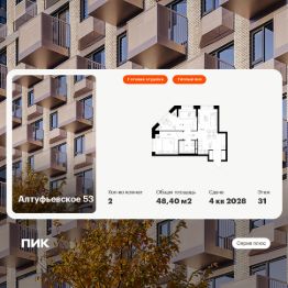 Продаётся 2-комн. квартира площадью 48,4 кв.м на 31 этаже 32 этажного дома (Корпус 1.1, Секция 2) проекта ПИК Алтуфьевское 53. Светлый просторный подъезд на уровне земли, функциональная планировка, большие окна, c отделкой.