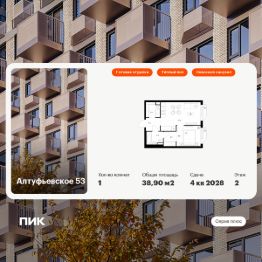 Продаётся 1-комн. квартира площадью 38,9 кв.м на 2 этаже 32 этажного дома (Корпус 1.1, Секция 2) проекта ПИК Алтуфьевское 53. Светлый просторный подъезд на уровне земли, функциональная планировка, большие окна, c отделкой.