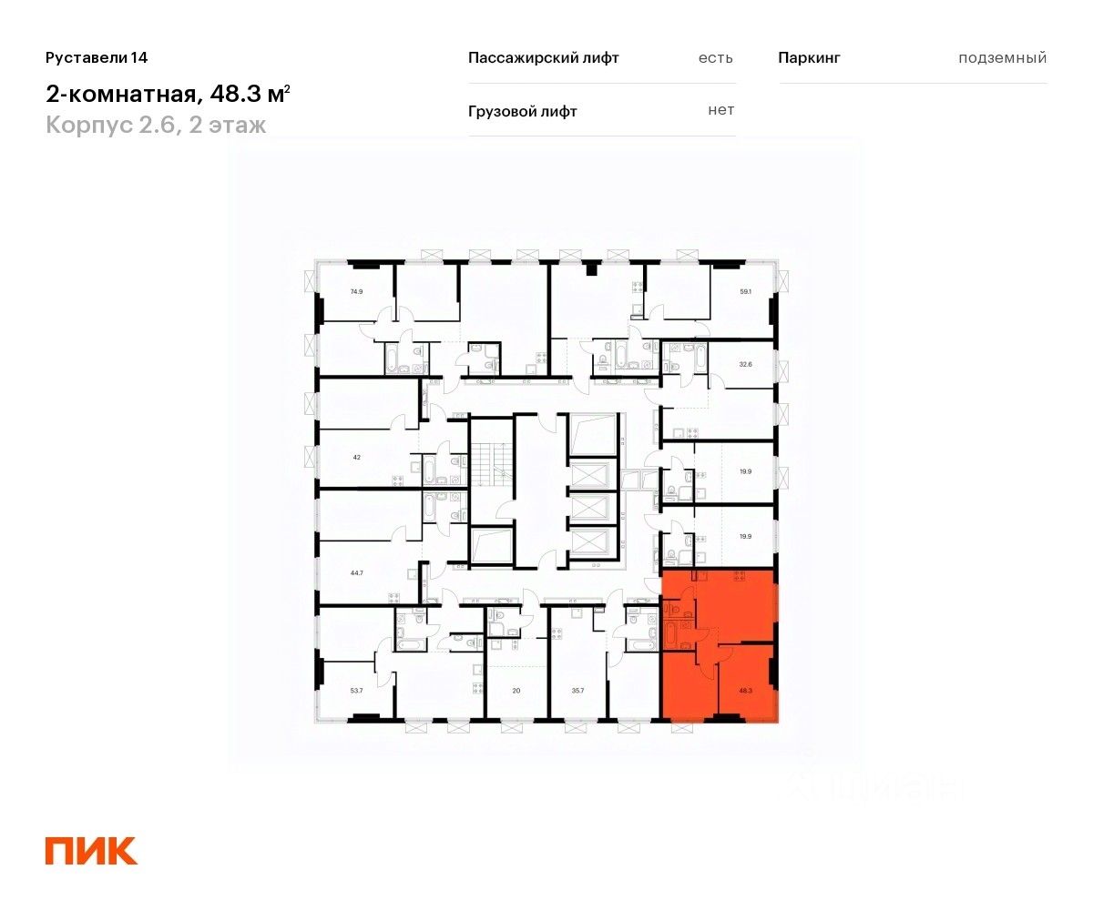 Продаётся 2-комн. квартира площадью 48,3 кв.м на 2 этаже 23 этажного дома (Корпус 2.6, Секция 2) проекта ПИК Руставели 14. Светлый просторный подъезд на уровне земли, функциональная планировка, большие окна, c отделкой.