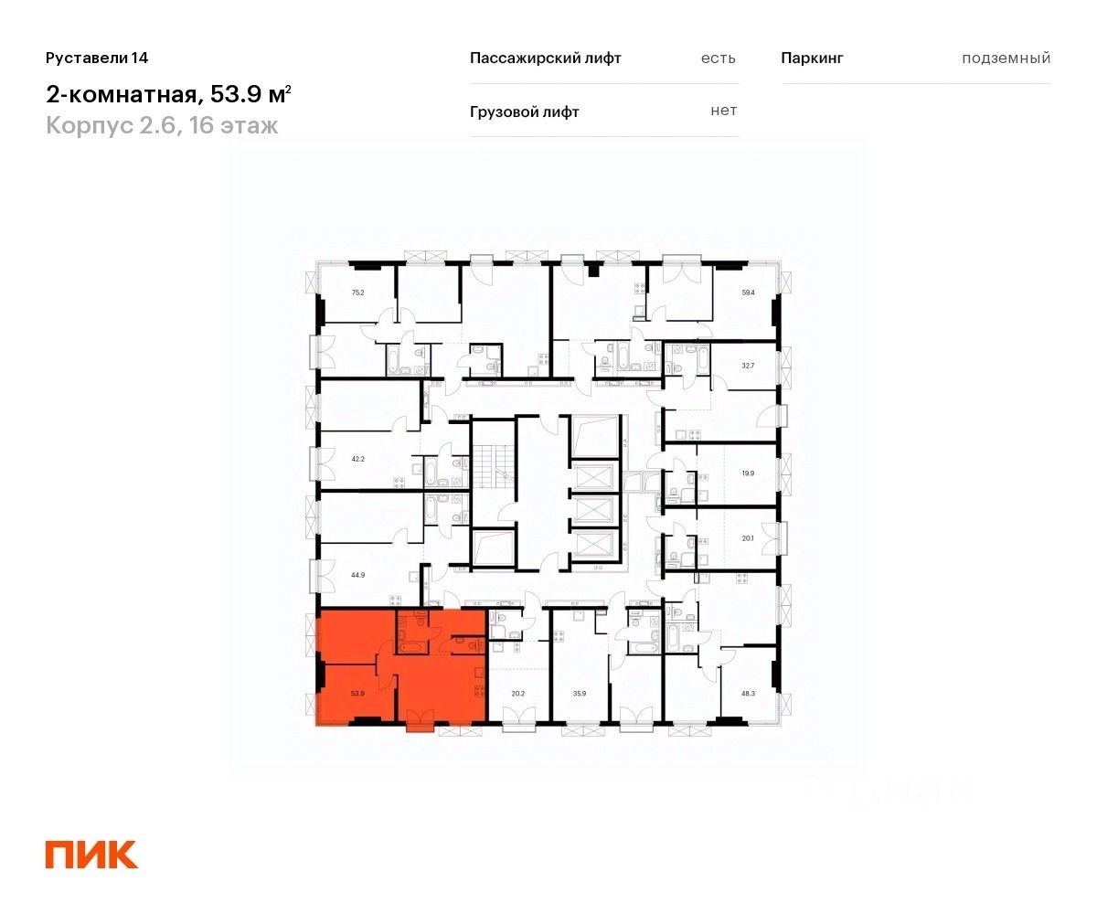 Продаётся 2-комн. квартира площадью 53,9 кв.м на 16 этаже 23 этажного дома (Корпус 2.6, Секция 2) проекта ПИК Руставели 14. Светлый просторный подъезд на уровне земли, функциональная планировка, большие окна, c отделкой.