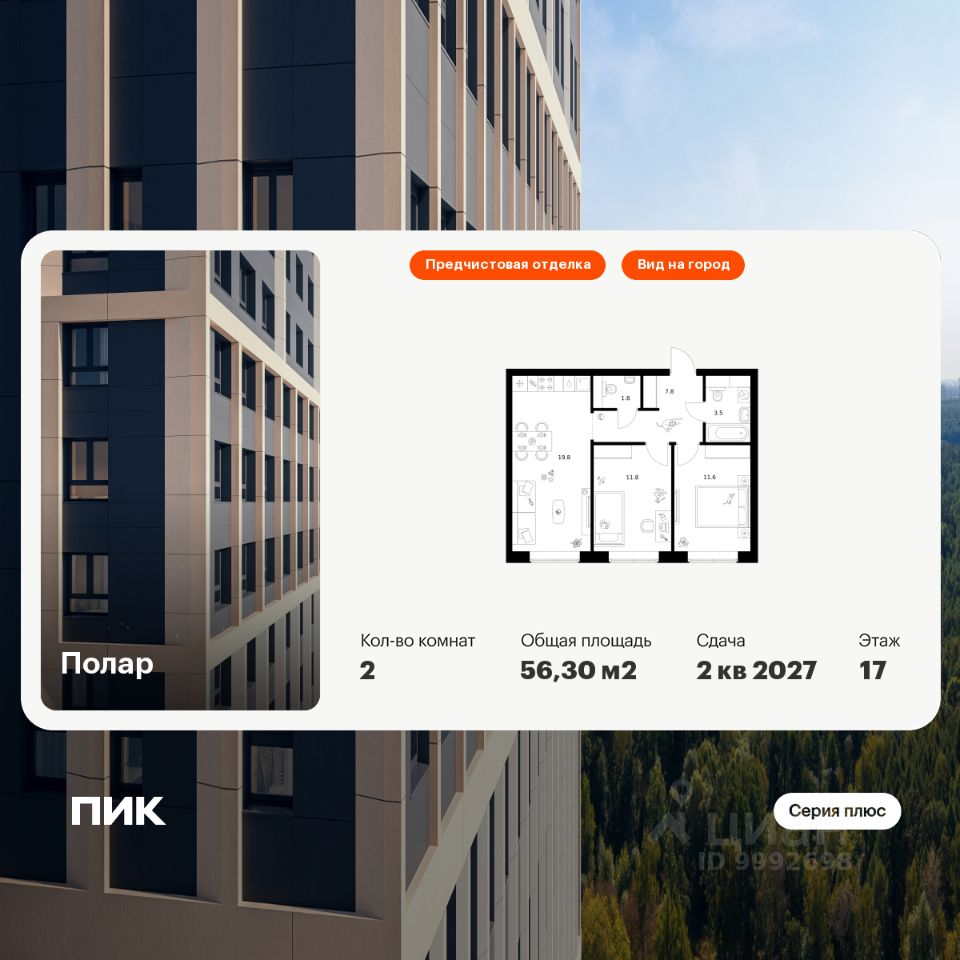 Продаётся 2-комн. квартира площадью 56,3 кв.м на 17 этаже 50 этажного дома (Корпус 1.5, Секция 2) проекта ПИК Полар. Светлый просторный подъезд на уровне земли, функциональная планировка, большие окна, предчистовая отделка.