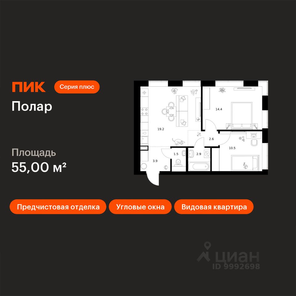 Продаётся 2-комн. квартира площадью 55 кв.м на 7 этаже 50 этажного дома (Корпус 1.5, Секция 2) проекта ПИК Полар. Светлый просторный подъезд на уровне земли, функциональная планировка, большие окна, предчистовая отделка.
