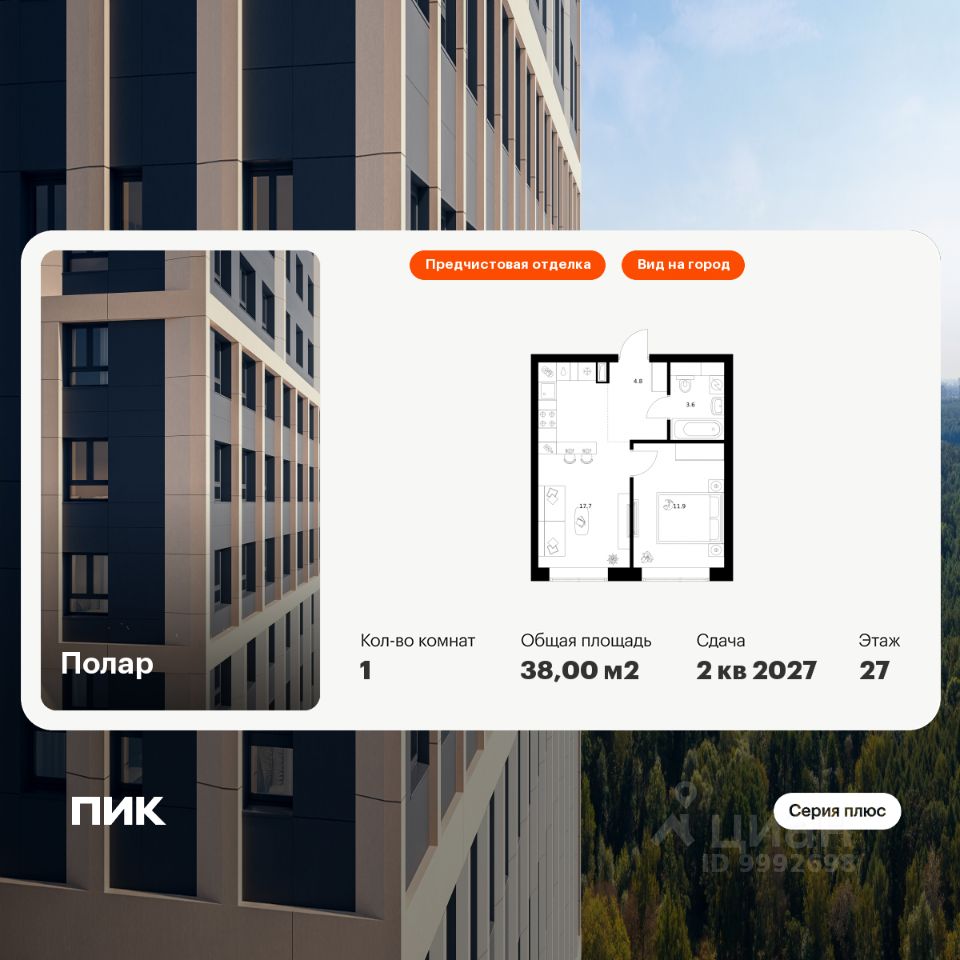 Продаётся 1-комн. квартира площадью 38 кв.м на 27 этаже 50 этажного дома (Корпус 1.5, Секция 2) проекта ПИК Полар. Светлый просторный подъезд на уровне земли, функциональная планировка, большие окна, предчистовая отделка.