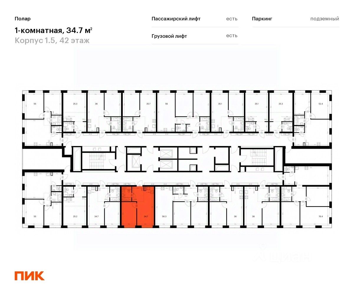 Продаётся 1-комн. квартира площадью 34,7 кв.м на 42 этаже 50 этажного дома (Корпус 1.5, Секция 2) проекта ПИК Полар. Светлый просторный подъезд на уровне земли, функциональная планировка, большие окна, предчистовая отделка.