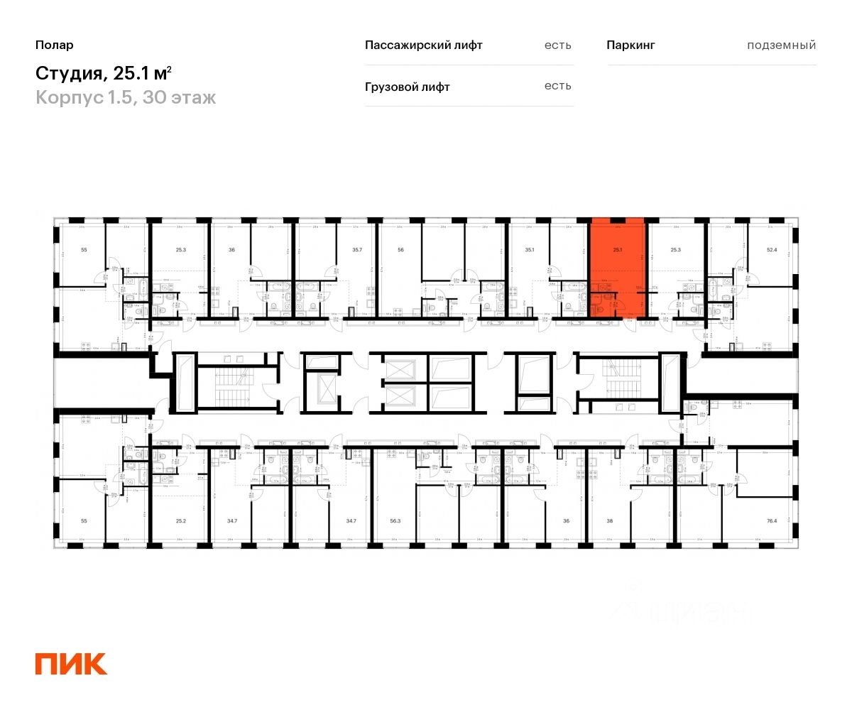 Продаётся квартира-студия площадью 25,1 кв.м на 30 этаже 50 этажного дома (Корпус 1.5, Секция 2) проекта ПИК Полар. Светлый просторный подъезд на уровне земли, функциональная планировка, большие окна, предчистовая отделка.