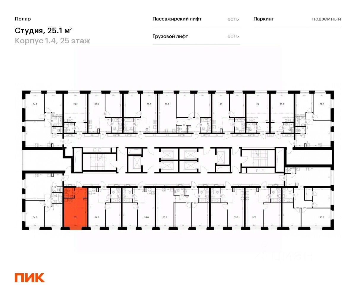 Продаётся квартира-студия площадью 25,1 кв.м на 25 этаже 45 этажного дома (Корпус 1.4, Секция 1) проекта ПИК Полар. Светлый просторный подъезд на уровне земли, функциональная планировка, большие окна, c отделкой.