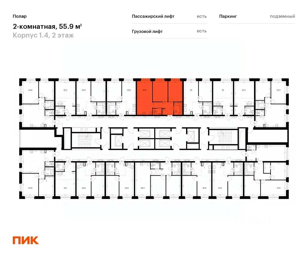 Продаётся 2-комн. квартира площадью 55,9 кв.м на 2 этаже 45 этажного дома (Корпус 1.4, Секция 1) проекта ПИК Полар. Светлый просторный подъезд на уровне земли, функциональная планировка, большие окна, c отделкой.