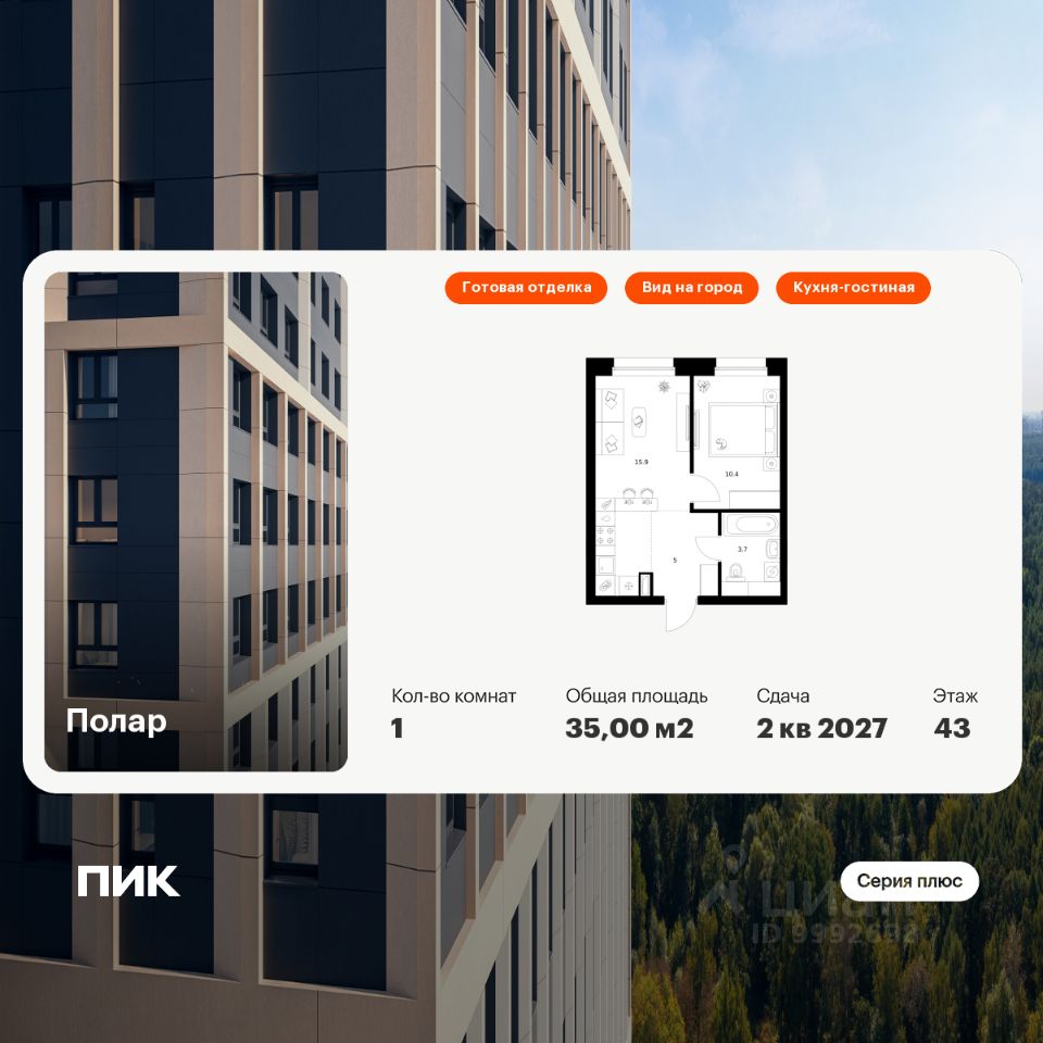 Продаётся 1-комн. квартира площадью 35 кв.м на 43 этаже 45 этажного дома (Корпус 1.4, Секция 1) проекта ПИК Полар. Светлый просторный подъезд на уровне земли, функциональная планировка, большие окна, c отделкой.