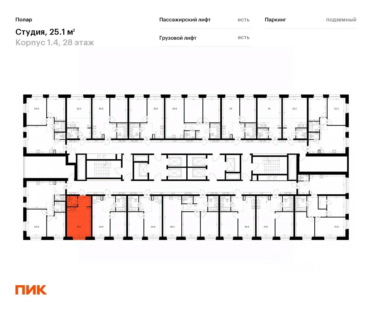 Продаётся квартира-студия площадью 25,1 кв.м на 28 этаже 45 этажного дома (Корпус 1.4, Секция 1) проекта ПИК Полар. Светлый просторный подъезд на уровне земли, функциональная планировка, большие окна, c отделкой.