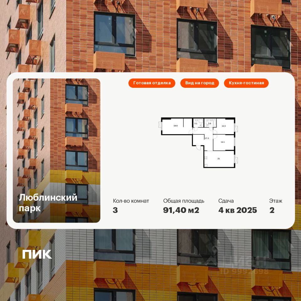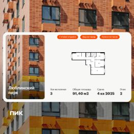 Продаётся 3-комн. квартира площадью 91,4 кв.м на 2 этаже 16 этажного дома (Корпус 12, Секция 4) проекта ПИК Люблинский парк. Светлый просторный подъезд на уровне земли, функциональная планировка, большие окна, c отделкой.