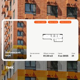 Продаётся 2-комн. квартира площадью 61,5 кв.м на 21 этаже 25 этажного дома (Корпус 12, Секция 1) проекта ПИК Люблинский парк. Светлый просторный подъезд на уровне земли, функциональная планировка, большие окна, c отделкой.