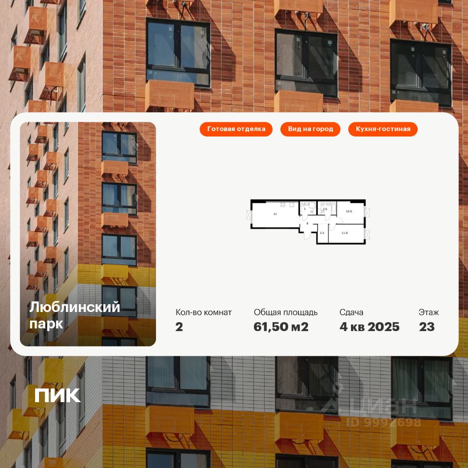 Продаётся 2-комн. квартира площадью 61,5 кв.м на 23 этаже 25 этажного дома (Корпус 12, Секция 5) проекта ПИК Люблинский парк. Светлый просторный подъезд на уровне земли, функциональная планировка, большие окна, c отделкой.
