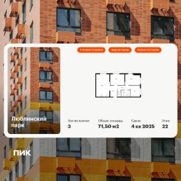 Продаётся 3-комн. квартира площадью 71,5 кв.м на 22 этаже 33 этажного дома (Корпус 14.5, Секция 3) проекта ПИК Люблинский парк. Светлый просторный подъезд на уровне земли, функциональная планировка, большие окна, c отделкой.