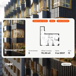 Продаётся 3-комн. квартира площадью 76,4 кв.м на 11 этаже 12 этажного дома (Корпус 1.1.1, Секция 1) проекта ПИК Кронштадтский 9. Светлый просторный подъезд на уровне земли, функциональная планировка, большие окна, предчистовая отделка.