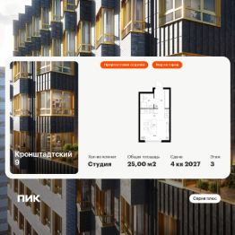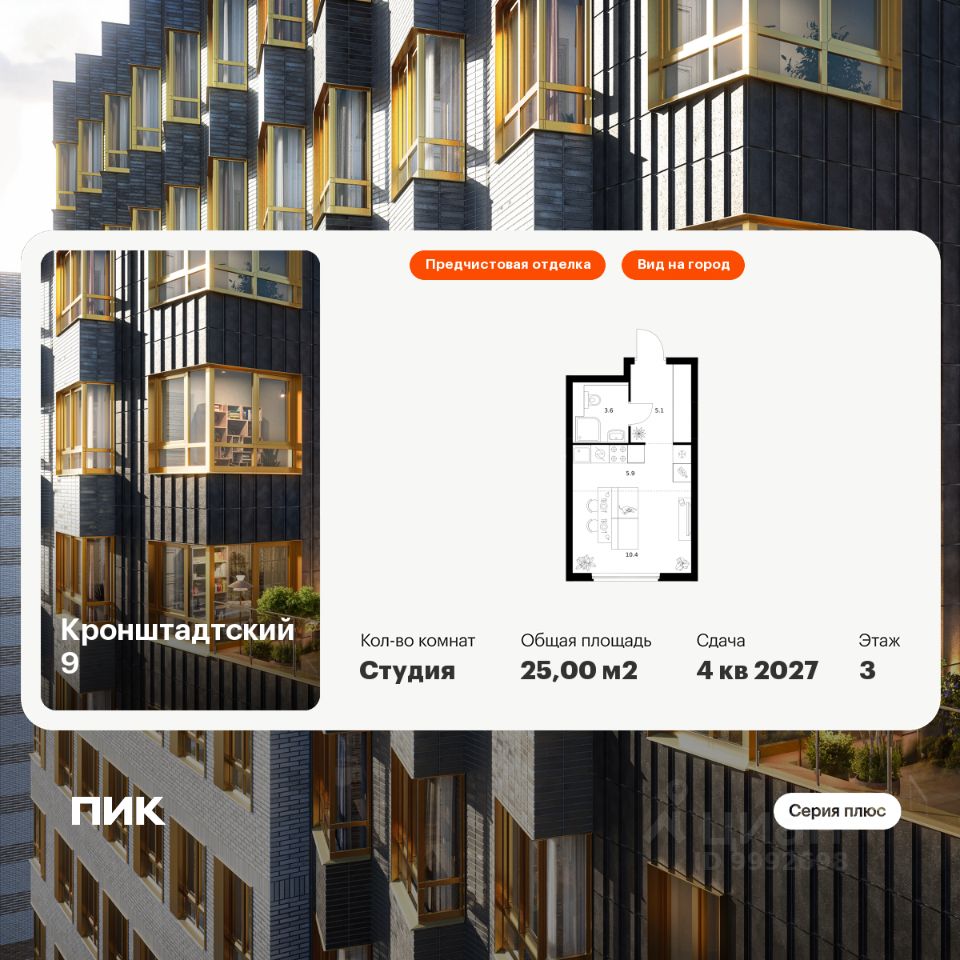 Продаётся квартира-студия площадью 25 кв.м на 3 этаже 12 этажного дома (Корпус 1.1.1, Секция 1) проекта ПИК Кронштадтский 9. Светлый просторный подъезд на уровне земли, функциональная планировка, большие окна, предчистовая отделка.