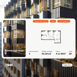 Продаётся 3-комн. квартира площадью 82,2 кв.м на 29 этаже 32 этажного дома (Корпус 1.1.3, Секция 3) проекта ПИК Кронштадтский 9. Светлый просторный подъезд на уровне земли, функциональная планировка, большие окна, предчистовая отделка.