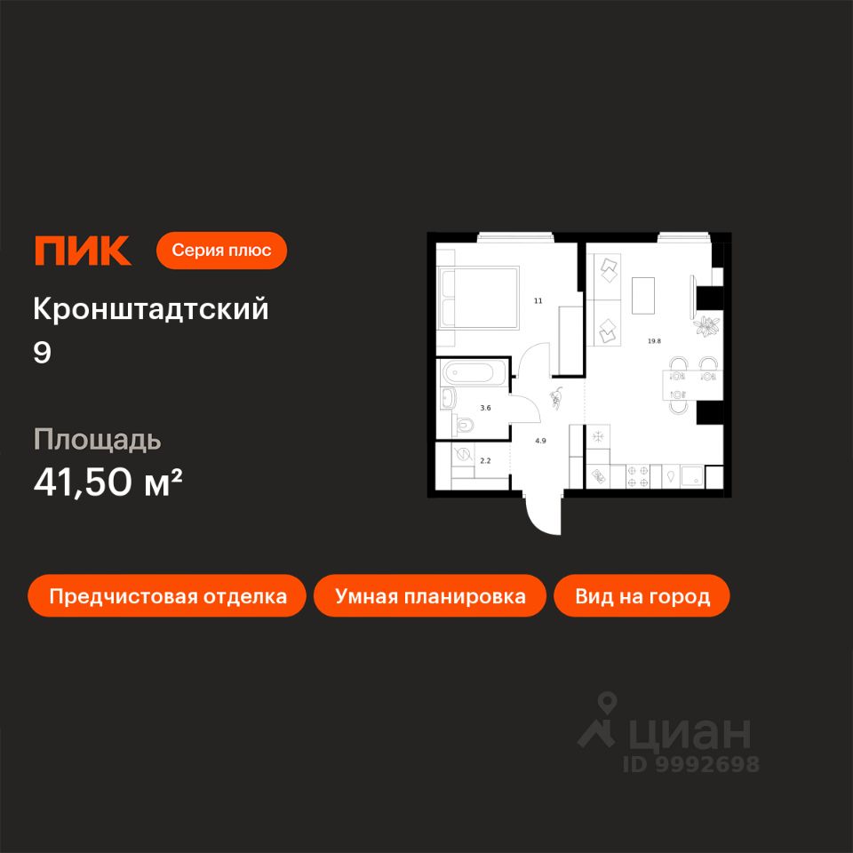 Продаётся 1-комн. квартира площадью 41,5 кв.м на 2 этаже 12 этажного дома (Корпус 1.1.2, Секция 2) проекта ПИК Кронштадтский 9. Светлый просторный подъезд на уровне земли, функциональная планировка, большие окна, предчистовая отделка.
