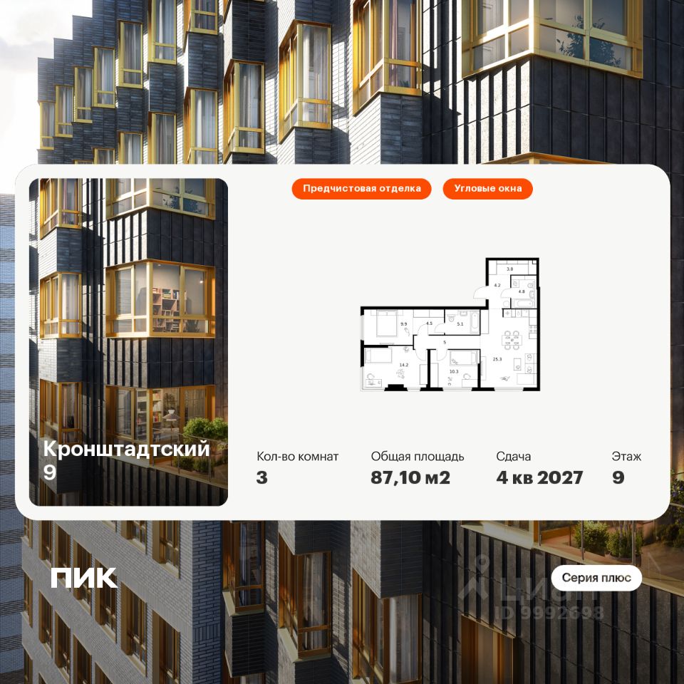 Продаётся 3-комн. квартира площадью 87,1 кв.м на 9 этаже 12 этажного дома (Корпус 1.1.2, Секция 2) проекта ПИК Кронштадтский 9. Светлый просторный подъезд на уровне земли, функциональная планировка, большие окна, предчистовая отделка.