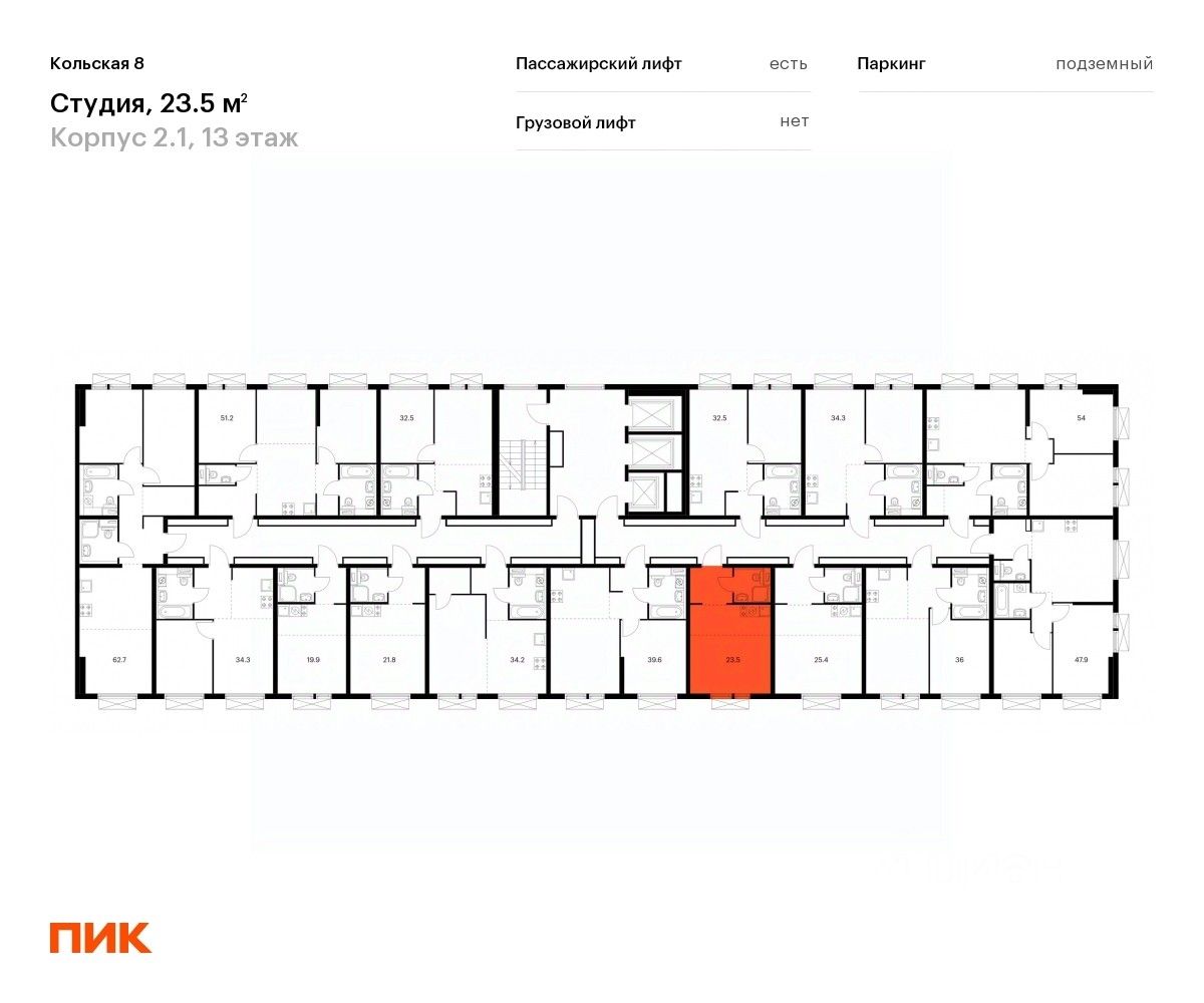 Продаётся квартира-студия площадью 23,3 кв.м на 13 этаже 25 этажного дома (Корпус 2.1, Секция 2) проекта ПИК Кольская 8. Светлый просторный подъезд на уровне земли, функциональная планировка, большие окна, c отделкой.