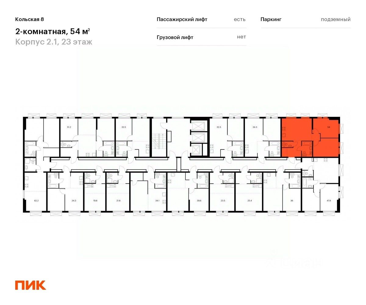 Продаётся 2-комн. квартира площадью 52,6 кв.м на 23 этаже 25 этажного дома (Корпус 2.1, Секция 2) проекта ПИК Кольская 8. Светлый просторный подъезд на уровне земли, функциональная планировка, большие окна, c отделкой.