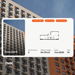 Продаётся 2-комн. квартира площадью 64,7 кв.м на 14 этаже 15 этажного дома (Корпус 2.1, Секция 3) проекта ПИК Кольская 8. Светлый просторный подъезд на уровне земли, функциональная планировка, большие окна, c отделкой.