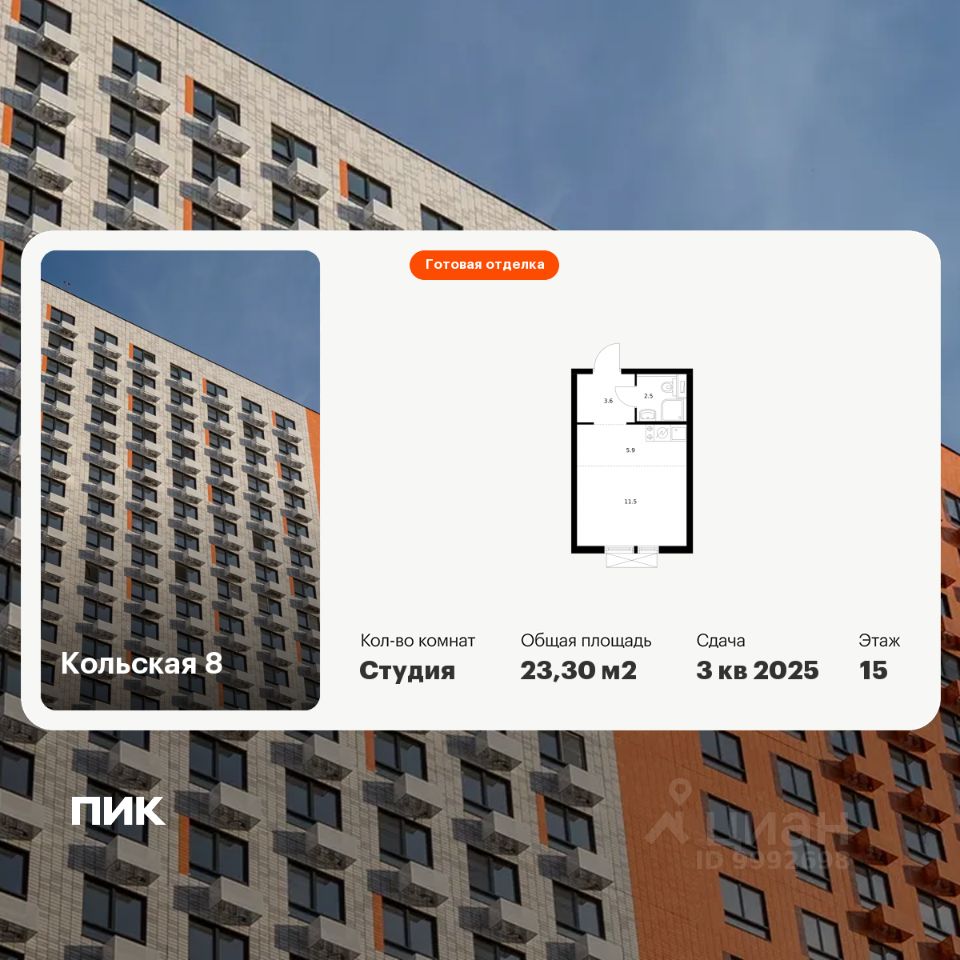 Продаётся квартира-студия площадью 23,3 кв.м на 15 этаже 25 этажного дома (Корпус 2.1, Секция 2) проекта ПИК Кольская 8. Светлый просторный подъезд на уровне земли, функциональная планировка, большие окна, c отделкой.