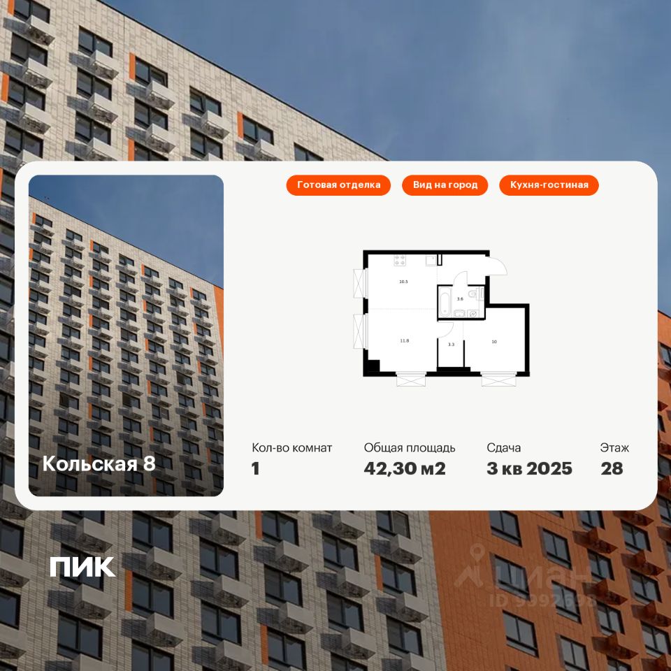 Продаётся 1-комн. квартира площадью 42,3 кв.м на 28 этаже 33 этажного дома (Корпус 2.4, Секция 1) проекта ПИК Кольская 8. Светлый просторный подъезд на уровне земли, функциональная планировка, большие окна, c отделкой.