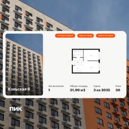 Продаётся 1-комн. квартира площадью 31,9 кв.м на 30 этаже 33 этажного дома (Корпус 2.4, Секция 1) проекта ПИК Кольская 8. Светлый просторный подъезд на уровне земли, функциональная планировка, большие окна, c отделкой.
