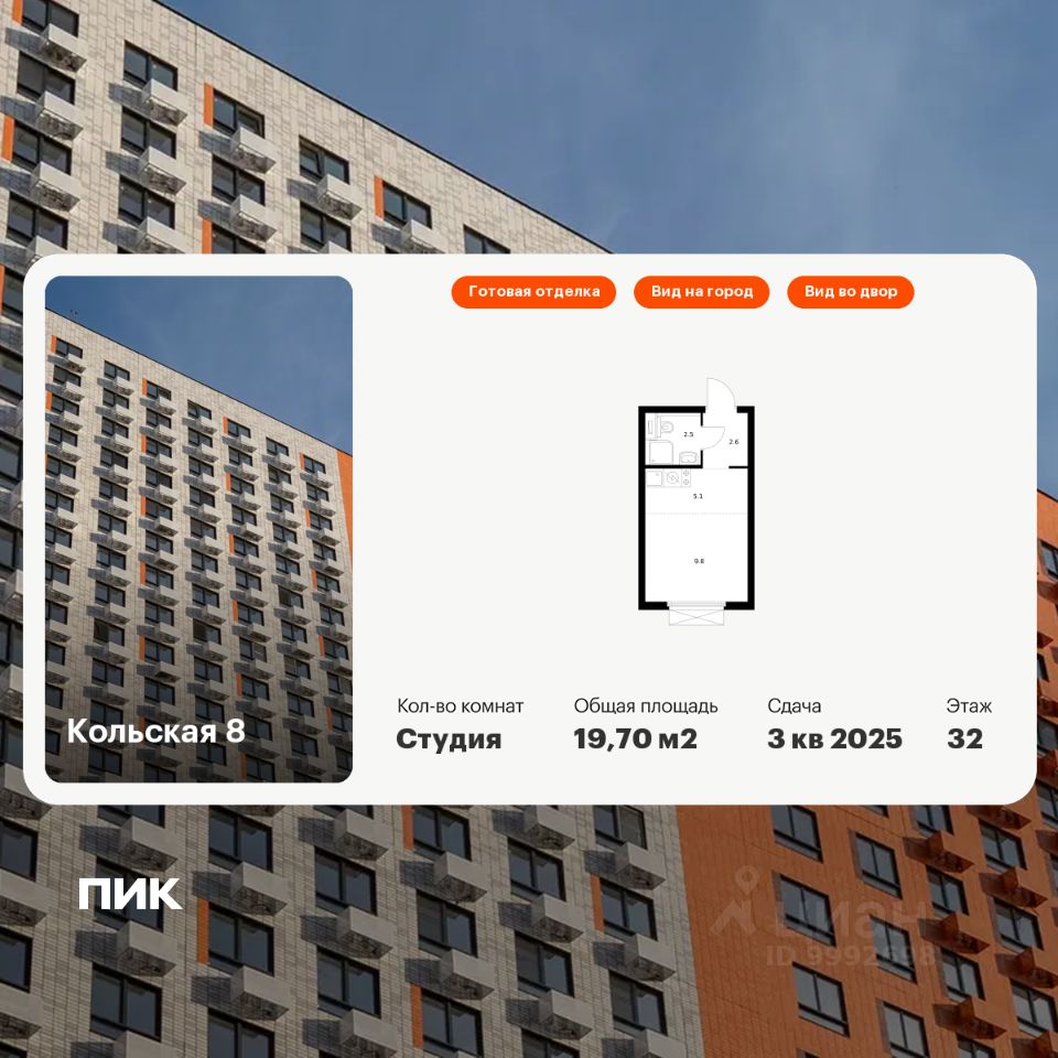 Продаётся квартира-студия площадью 19,7 кв.м на 32 этаже 33 этажного дома (Корпус 2.4, Секция 1) проекта ПИК Кольская 8. Светлый просторный подъезд на уровне земли, функциональная планировка, большие окна, c отделкой.