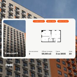 Продаётся 2-комн. квартира площадью 59,6 кв.м на 23 этаже 33 этажного дома (Корпус 2.4, Секция 1) проекта ПИК Кольская 8. Светлый просторный подъезд на уровне земли, функциональная планировка, большие окна, c отделкой.