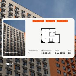 Продаётся 1-комн. квартира площадью 42,3 кв.м на 26 этаже 33 этажного дома (Корпус 2.4, Секция 1) проекта ПИК Кольская 8. Светлый просторный подъезд на уровне земли, функциональная планировка, большие окна, c отделкой.
