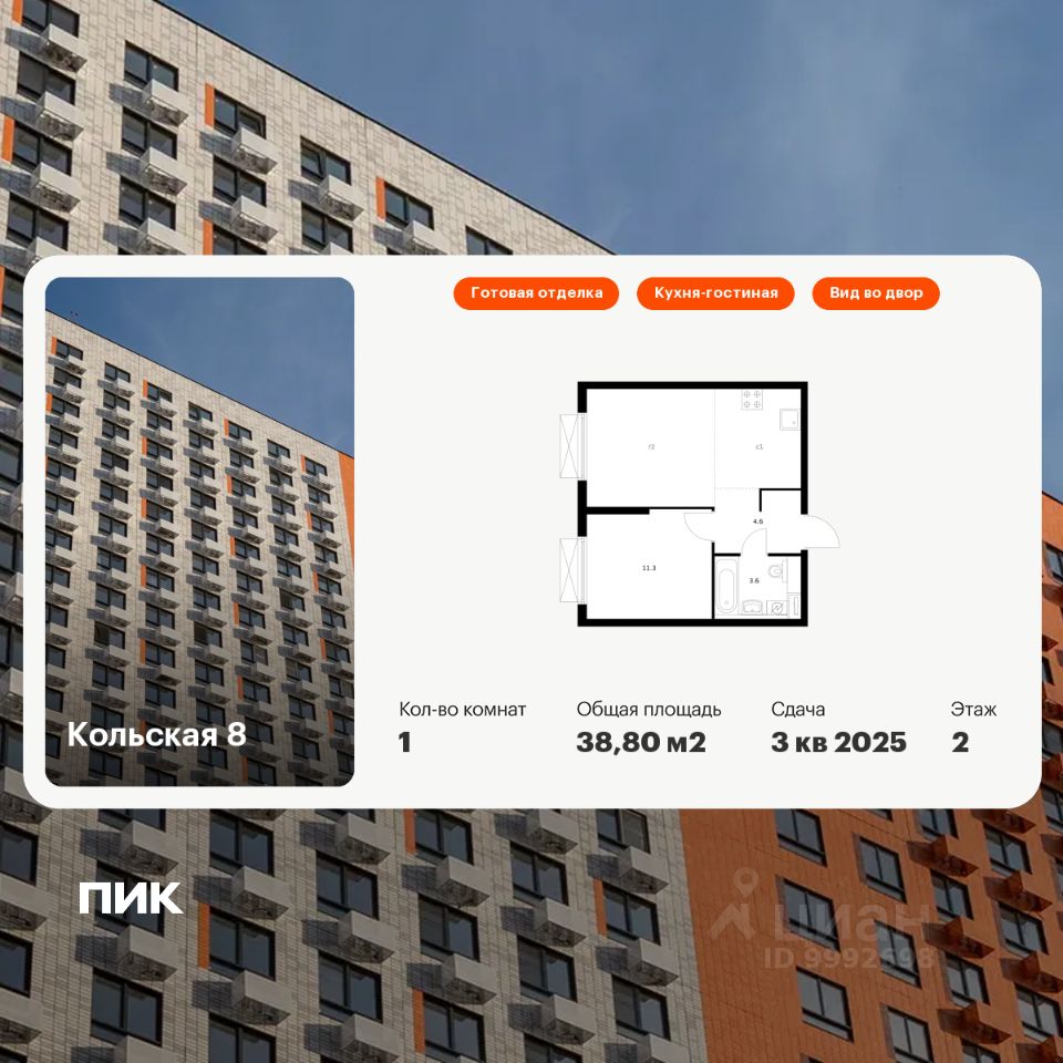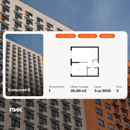 Продаётся 1-комн. квартира площадью 38,8 кв.м на 2 этаже 24 этажного дома (Корпус 2.2, Секция 5) проекта ПИК Кольская 8. Светлый просторный подъезд на уровне земли, функциональная планировка, большие окна, c отделкой.