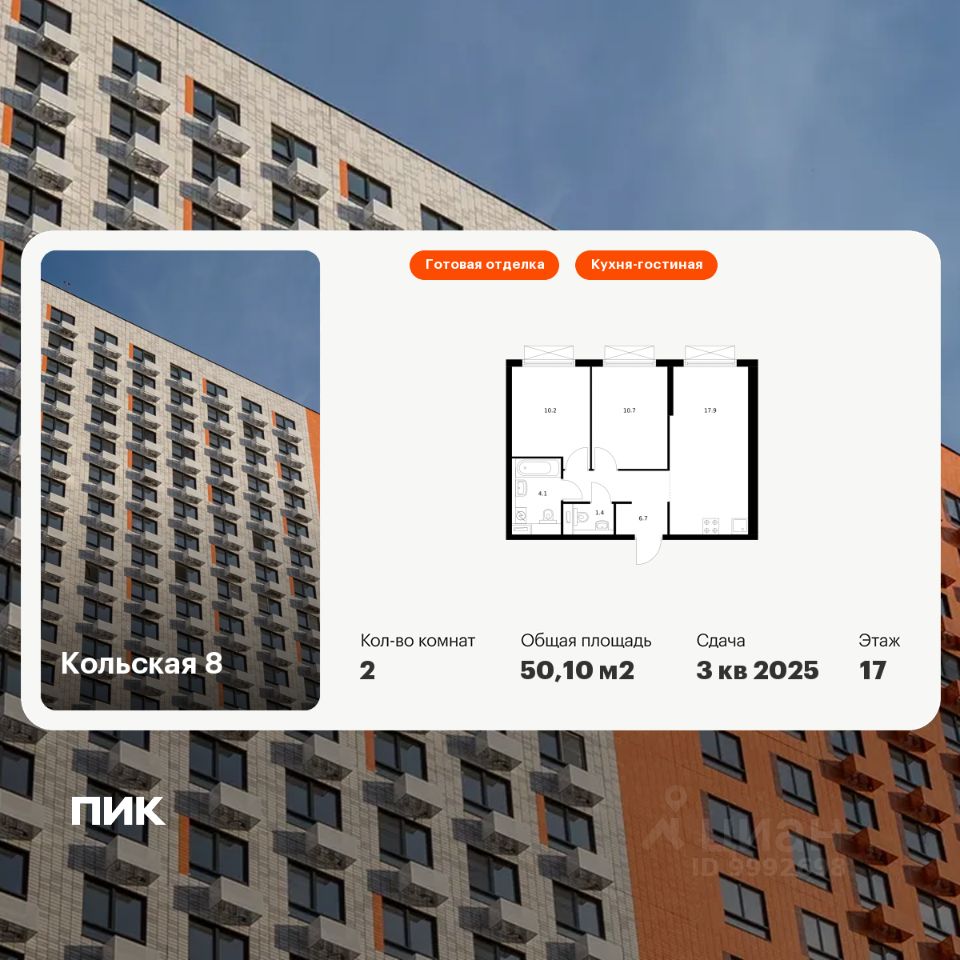 Продаётся 2-комн. квартира площадью 50,1 кв.м на 17 этаже 24 этажного дома (Корпус 2.2, Секция 5) проекта ПИК Кольская 8. Светлый просторный подъезд на уровне земли, функциональная планировка, большие окна, c отделкой.