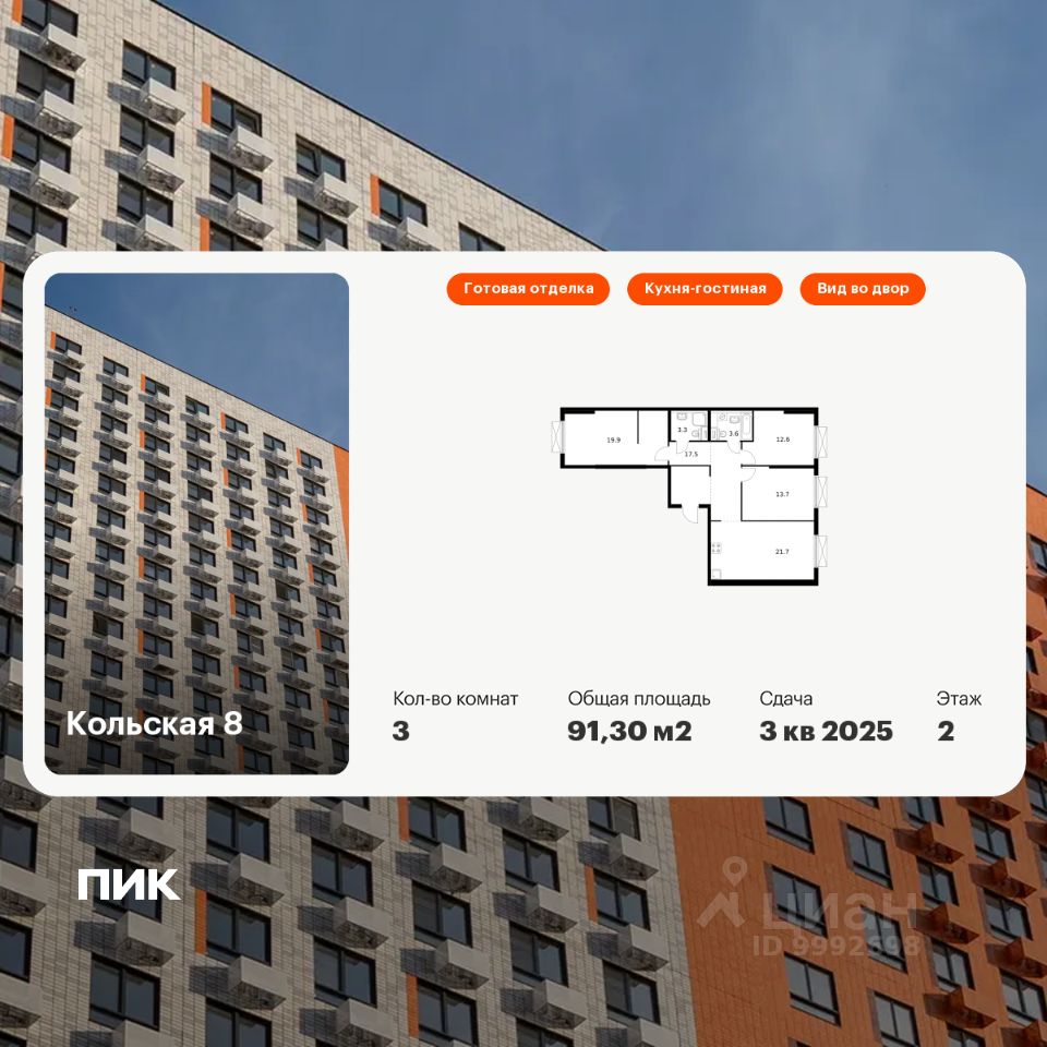 Продаётся 3-комн. квартира площадью 91,3 кв.м на 2 этаже 15 этажного дома (Корпус 2.2, Секция 6) проекта ПИК Кольская 8. Светлый просторный подъезд на уровне земли, функциональная планировка, большие окна, c отделкой.