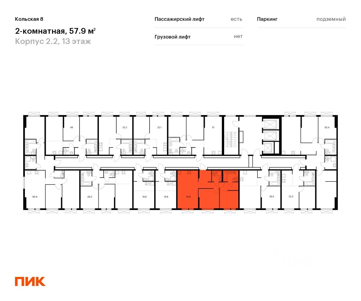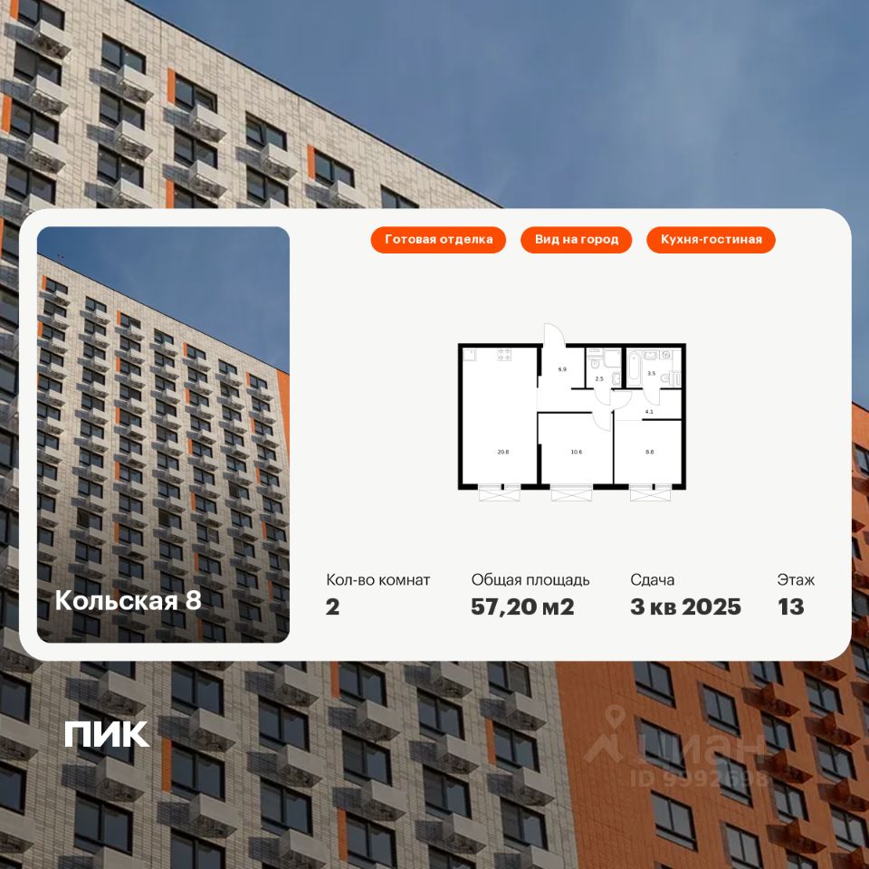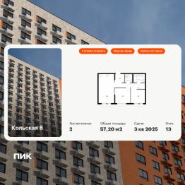 Продаётся 2-комн. квартира площадью 57,2 кв.м на 13 этаже 24 этажного дома (Корпус 2.2, Секция 5) проекта ПИК Кольская 8. Светлый просторный подъезд на уровне земли, функциональная планировка, большие окна, c отделкой.