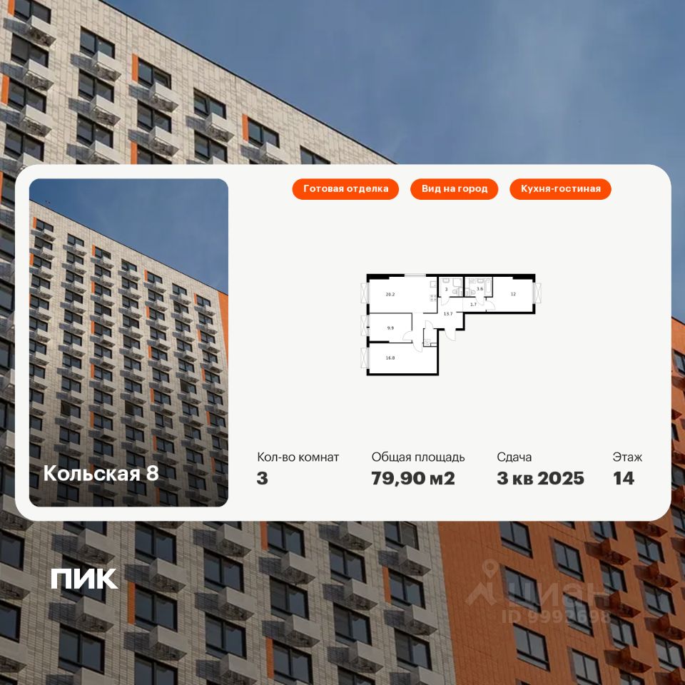 Продаётся 3-комн. квартира площадью 79,9 кв.м на 14 этаже 24 этажного дома (Корпус 2.2, Секция 5) проекта ПИК Кольская 8. Светлый просторный подъезд на уровне земли, функциональная планировка, большие окна, c отделкой.