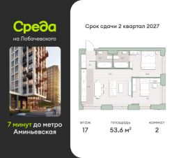 Продаётся 2-комнатная квартира общей площадью 53.6 кв.м. с отделкой white box. Квартира расположена на 17 этаже корпуса 5.4 в жилом комплексе бизнес-класса "Среда на Лобачевского" в пешей доступности от метро "Аминьевская".