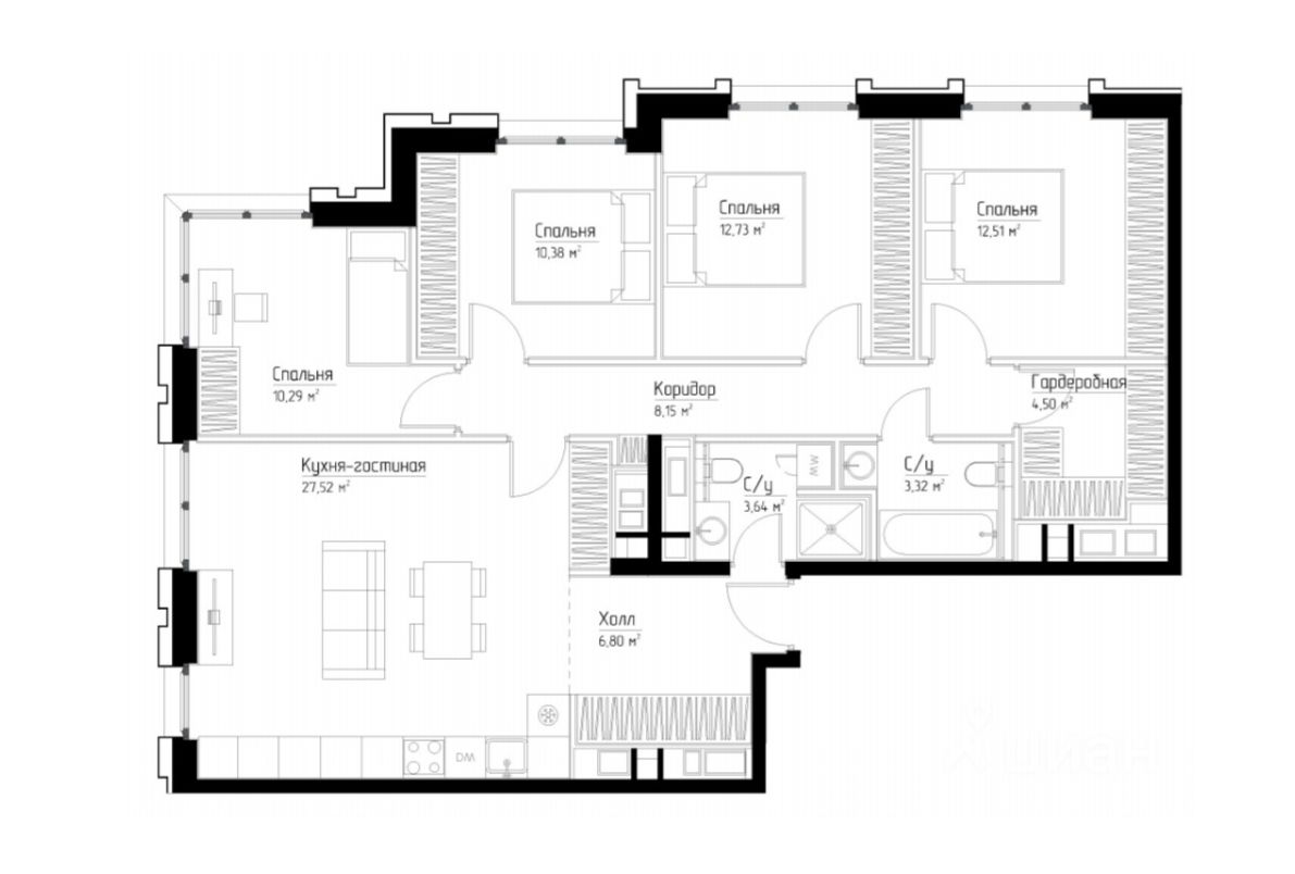 О квартире: 4 изолированные спальни, просторная кухня-гостинная, 2 совмещенных с/у.