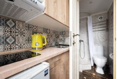 • кухня-гостиная укомплектованная всей техникой (плита, микроволновка, холодильник) обеденная зона со столом и стульями зона отдыха с кроватью и телевизором