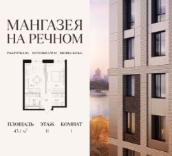 В продаже 1-к квартира площадью 43.1 м2. Функциональная планировка, кухня-гостиная, просторные санузел и гардеробная. Квартира расположена на 11-м этаже 24-этажного дома.