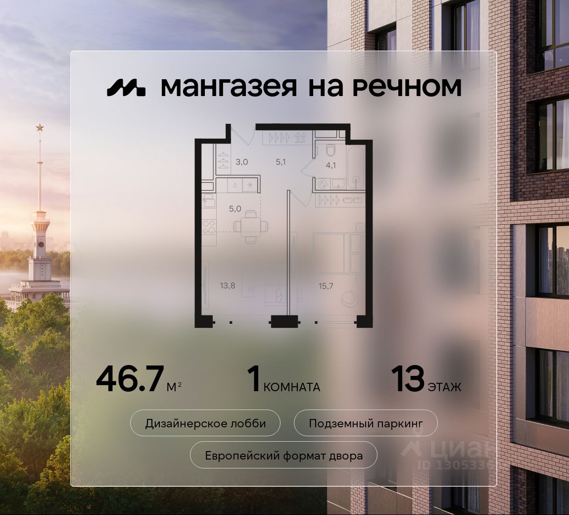 - 10 минут пешком до м. Речной вокзал