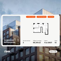 Продаётся 2-комн. квартира площадью 60,3 кв.м на 12 этаже 16 этажного дома (Корпус 2.6/1.3, Секция 3) проекта ПИК Бунинская набережная. Светлый просторный подъезд на уровне земли, функциональная планировка, большие окна, c отделкой.
