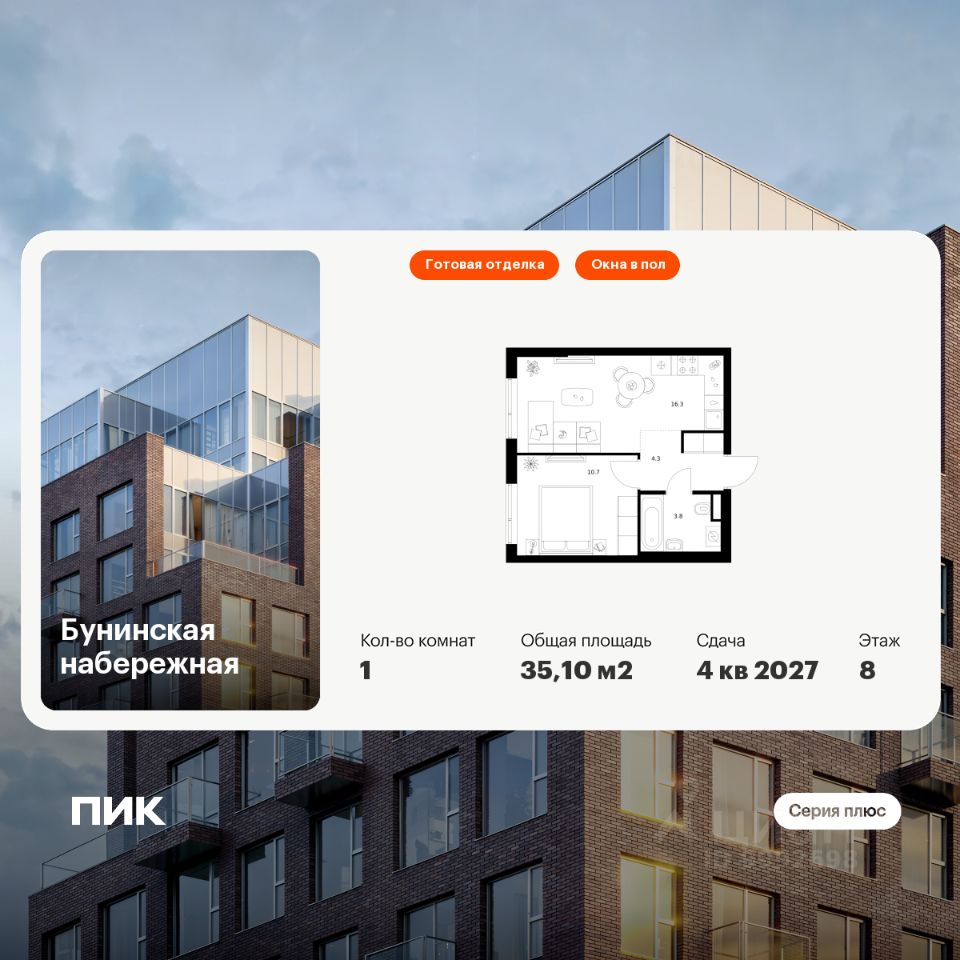 Продаётся 1-комн. квартира площадью 35,1 кв.м на 8 этаже 16 этажного дома (Корпус 2.6/1.3, Секция 3) проекта ПИК Бунинская набережная. Светлый просторный подъезд на уровне земли, функциональная планировка, большие окна, c отделкой.