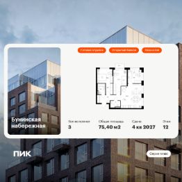 Продаётся 3-комн. квартира площадью 75,4 кв.м на 12 этаже 16 этажного дома (Корпус 2.6/1.4, Секция 4) проекта ПИК Бунинская набережная. Светлый просторный подъезд на уровне земли, функциональная планировка, большие окна, c отделкой.