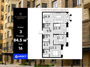 Площадь квартиры составляет 84,50 кв.м и находится на 16-ом этаже 19-этажного здания. Концепция комплекса вдохновлена театральной тематикой, предлагая сочетание неоклассической архитектуры с оригинальной отделкой холлов, изысканными фасадами и созданием культурно-просветительского пространства.